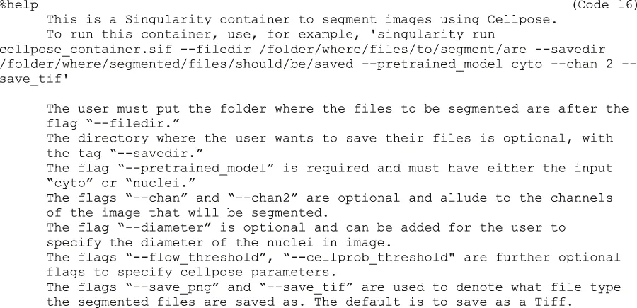 9f)Next, provide a help section (Code 16). This section is important for users to understand how to use the container and can be called by entering “singularity run-help cellpose_container.sif”: