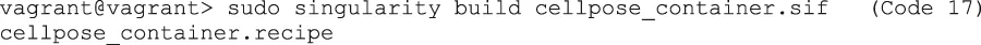 | Code 17 | vagrant@vagrant> sudo singularity build cellpose_container.sif cellpose_container.recipe |