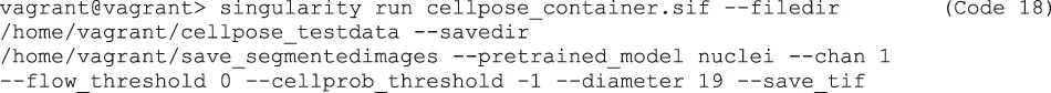| Code 18 | vagrant@vagrant> singularity run cellpose_container.sif --filedir /home/vagrant/cellpose_testdata --savedir /home/vagrant/cellpose_testdata/save_segmentedimages --pretrained_model nuclei --chan 1 --flow_threshold 0 --cellprob_threshold −1 --diameter 19 --save_tif |