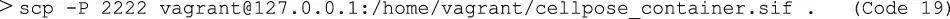 | Code 19 | > scp -P 2222 vagrant@127.0.0.1:/home/vagrant/cellpose_container.sif . |