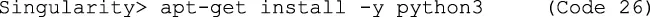 | Code 26 | Singularity> apt-get install -y python3 |