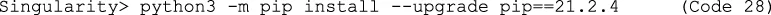 | Code 28 | Singularity> python3 -m pip install --upgrade pip==21.2.4 |