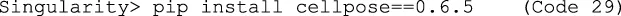 | Code 29 | Singularity> pip install cellpose==0.6.5 |