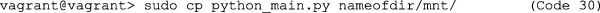 | Code 30 | vagrant@vagrant> sudo cp python_main.py nameofdir/mnt/ |