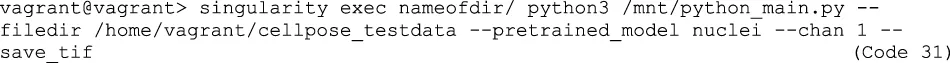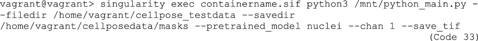| Code 33 | vagrant@vagrant> singularity exec containername.sif python3 /mnt/python_main.py --filedir /home/vagrant/cellpose_testdata --savedir /home/vagrant/cellposedata/masks --pretrained_model nuclei --chan 1 --save_tif |