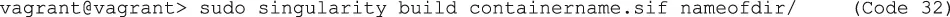 | Code 32 | vagrant@vagrant> sudo singularity build containername.sif nameofdir/ |