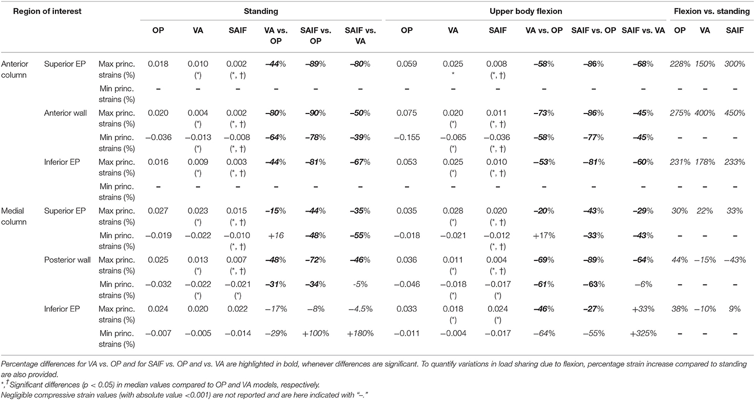 Table 2. Median principal strains values obtained in all regions of interest of the treated vertebra (L3) both for standing and upper body flexion on OP, VA, and SAIF models.