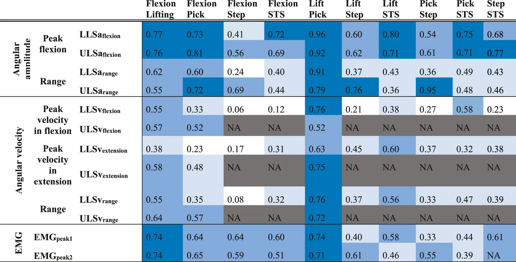 Correlations in angular amplitude, angular velocity and muscle activity between different functional tasks. The darkness of the blue represents the strength of the correlation: white: r < 0.3; pale blue: 0.3 ≤ r < 0.5; blue: 0.5 ≤ r < 0.7; dark blue: r ≥ 0.7. Correlations in blue (r ≥ 0.3) all have a p-value <0.05. NA: variables not available as there were no characteristic pattern (see Data Processing). STS: sit-to-stand; LLS: Lower lumbar spine; ULS: Upper lumbar spine. EMGpeak1: first peak of maximal paraspinal muscles activity; EMGpeak2: second peak of maximal paraspinal muscles activity. Correlations between EMGpeak2 of flexion, lifting and picking-up and EMGpeak1 of stepping-up and sit-to-stand are reported in the last line (during stepping-up and sit-to-stand, there is only one peak of paraspinal muscle activity, see Data Processing).