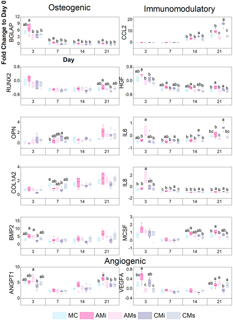 FIGURE 5. A custom NanoString code set was used to measure hMSC osteogenic and immunomodulatory gene expression in response to scaffold content (mineralized collagen, MC; mineralized collagen amnion incorporated, AMi; mineralized collagen chorion incorporated, CMi; mineralized collagen amnion extracts, AMs; mineralized collagen chorion extracts, CMs). Gene expression is represented as a fold change compared to hMSC gene expression prior to seeding on the scaffolds, normalized to GAPDH (n = 5). Different letter indicated significance at a level of p < 0.05 within the same day.