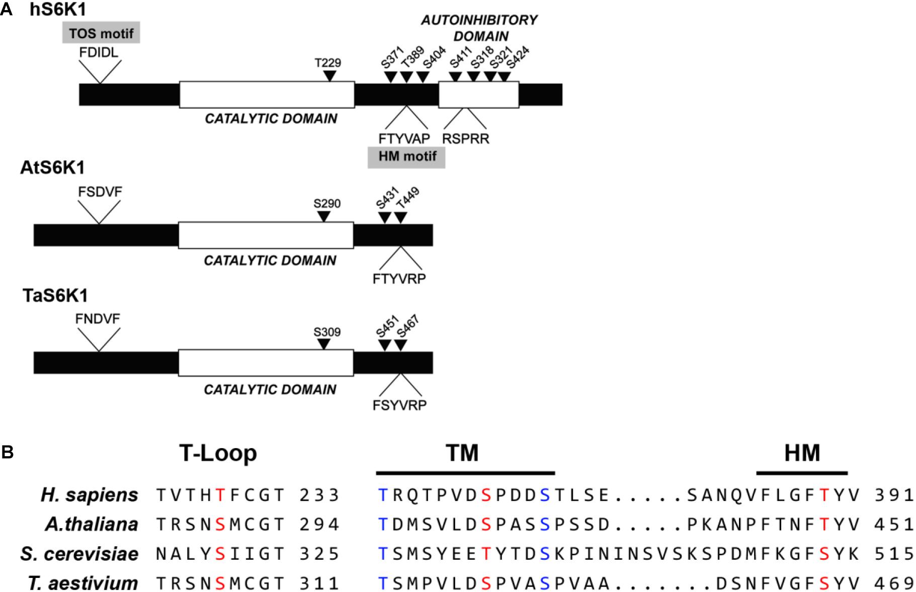 Figure 4. The protein kinase sequence analysis of Triticum aestivum ribosomal protein S6 kinase 1 (TaS6K1) and its alignment with the orthologs. (A) Comparison of human S6K1 (hS6K1), A. thaliana S6K1 (AtS6K1), and T. aestivum S6K1 (TaS6K1). hS6K1 contains a TOS-motif, catalytic domain, and autoinhibitory domain, whereas TaS6K1 and AtS6K1 have a putative catalytic domain. Possible phosphorylation sites in TaS6K1 were predicted based on the comparison with phosphorylation sites of hS6K1. Conserved and important serine (S) and threonine (T) residues are marked with arrows. (B) Sequence alignment of the T-loop, turn motif (TM), and hydrophobic motif (HM) of hS6K1, AtS6K1, TaS6K1, and Saccharomyces cerevisiae Ypk3.