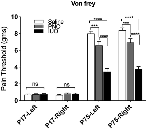 Figure 4. Measurement of pain thresholds using the Von Frey test. Animals from each group (n = 4) were tested at P17 and again at P75 to determine changes in pain thresholds. At P75, the oxy-exposed groups had lower pain thresholds than controls. Additionally, IUO pups had lower pain thresholds than PNO pups. All data represented as mean ± SEM. ***p < 0.001, ****p < 0.0001.