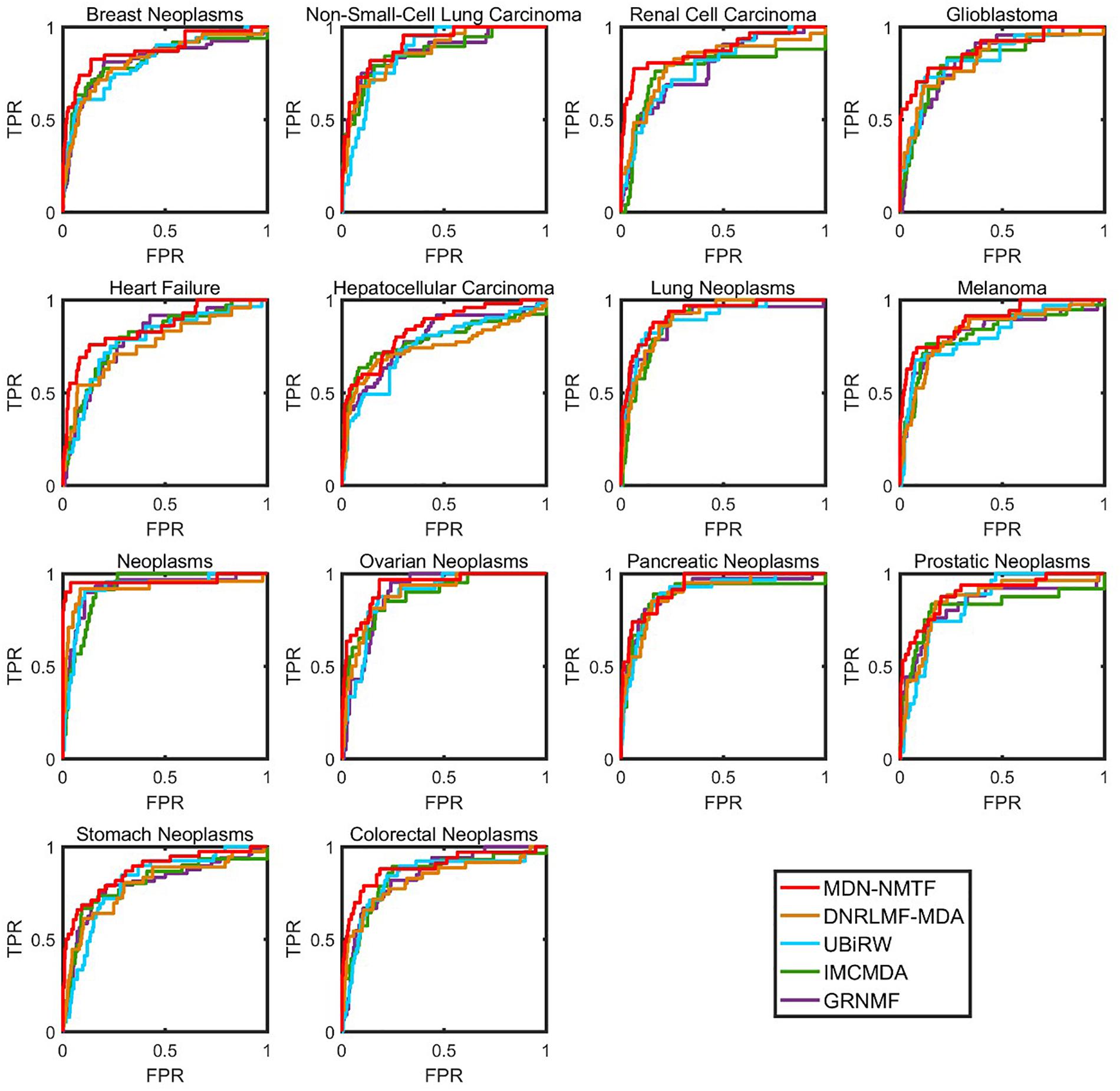 Figure 2. The ROC curves of MDN-NMTF and other four methods for 14 diseases on HMDD2.0-Yan Dataset. The figure shows that the ROC curves of MDN-NMTF in 14 diseases are all higher than that of the other four methods.