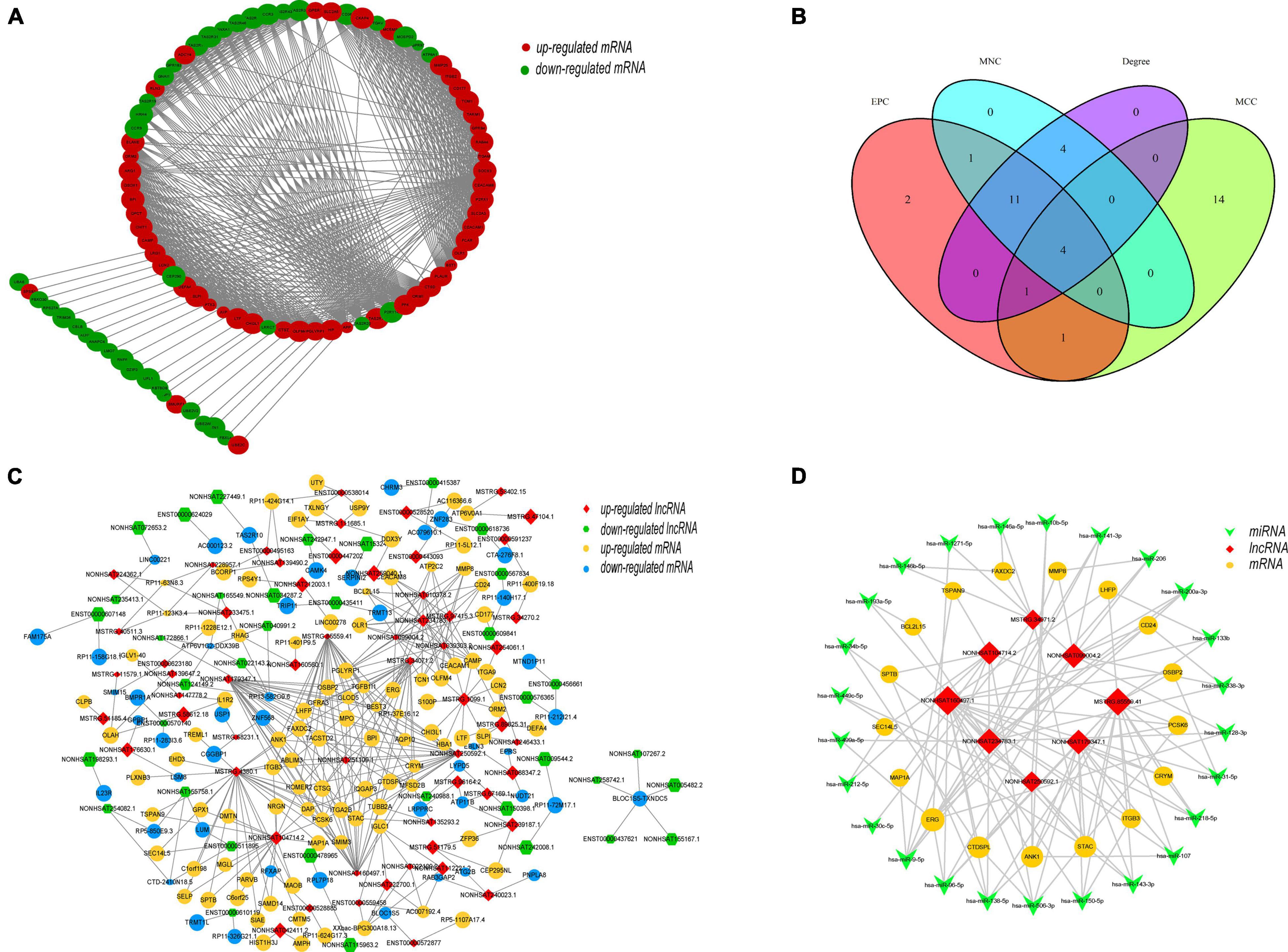 Cytoscape was used to construct and visualize the PPI network, while the MCODE plugin was used to extract gene cluster modules. We selected the module with the highest score (score: 22.742), which had 90 proteins and 1012 edges and is shown in Figure 7A. Furthermore, we used another plugin of Cytoscape, cytoHubba, to identify the hub genes. Four of its algorithms—the Maximum Neighborhood Component, Maximal Clique Centrality, Edge Percolated Component, and Degree—were used to calculate the top 20 hub genes (Chin et al., 2014; Luan et al., 2020). The results of the four algorithms intersected and are shown in a Venn diagram (Figure 7B). We identified four hub genes: CEACAM8, ELANE, ITGAM, and ITGB2. Moreover, a coexpression network of DELs and DEMs was constructed, which comprised 94 lncRNAs, 145 mRNAs, and 371 edges (PCC > 0.995) (Figure 7C). Within the coexpression network, MSTRG.4380.1 had the most coexpressed mRNAs (Park et al., 2009), and DAP, HOMER2, PCSK6, and STAC had the largest number of coexpressed lncRNAs (Chen et al., 2017). After incorporation of the predicted target miRNAs, we finally obtained 25 target miRNAs. A ceRNA network was constructed by Cytoscape, which consisted of 8 lncRNAs, 25 miRNAs, and 17 mRNAs (Figure 7D). These results reveal the regulatory mechanism of these lncRNAs at the transcriptome level. They can act directly on genes and regulate gene expression after interacting with miRNA.