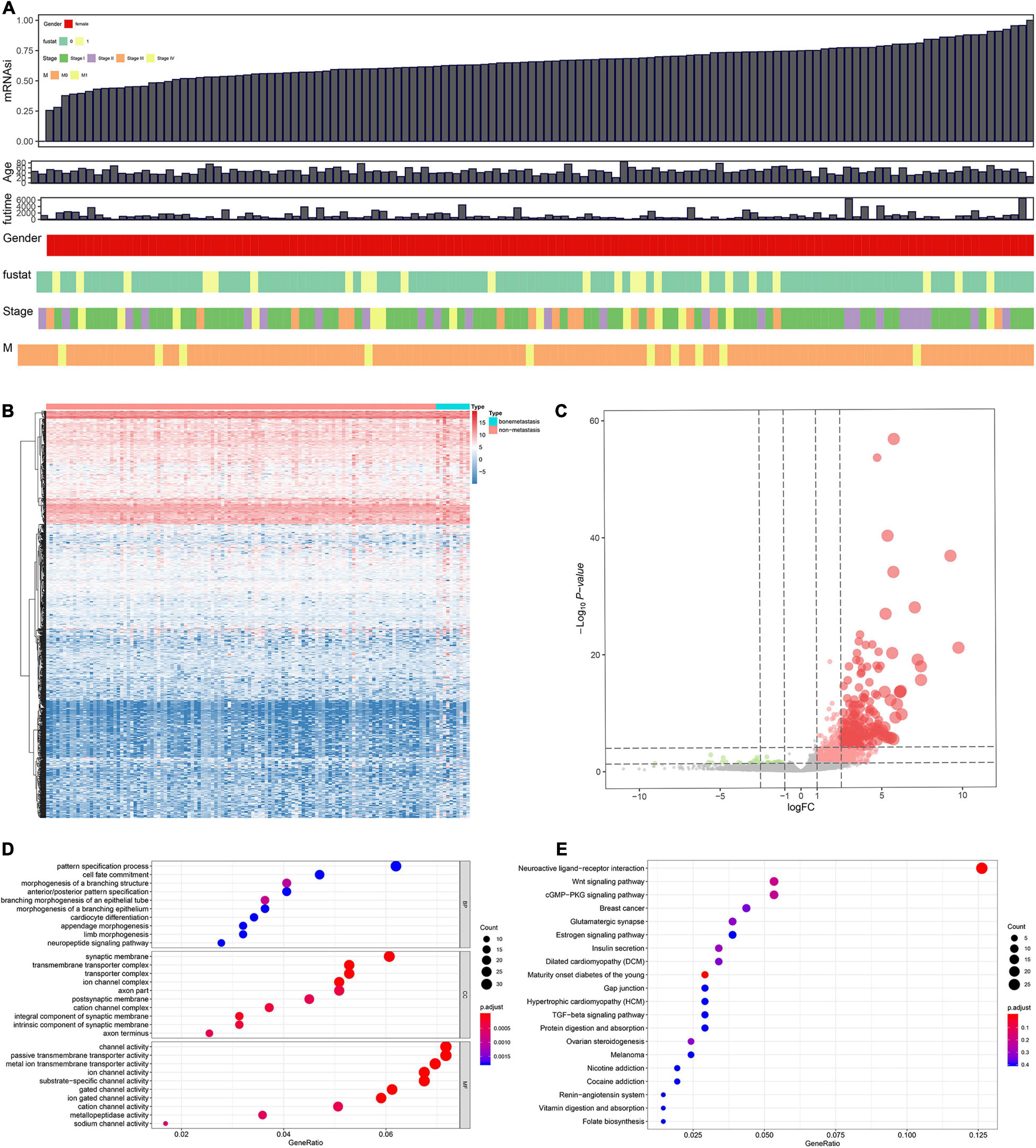 Figure 2. Combinative analyses based on gene expression stemness indices (A). Heat map for the differentially expressed genes (DEGs) between 10 metastatic and 116 non-metastatic patients with the cervical squamous cell carcinoma and endocervical adenocarcinoma (CESC) (B). Volcano plot for DEGs between 10 metastatic and 116 non-metastatic patients with CESC (C). The functional enrichment analysis for these DEGs in Gene Ontology (GO) terms (D) and Kyoto Encyclopedia of Genes and Genomes (KEGG) pathways (E).