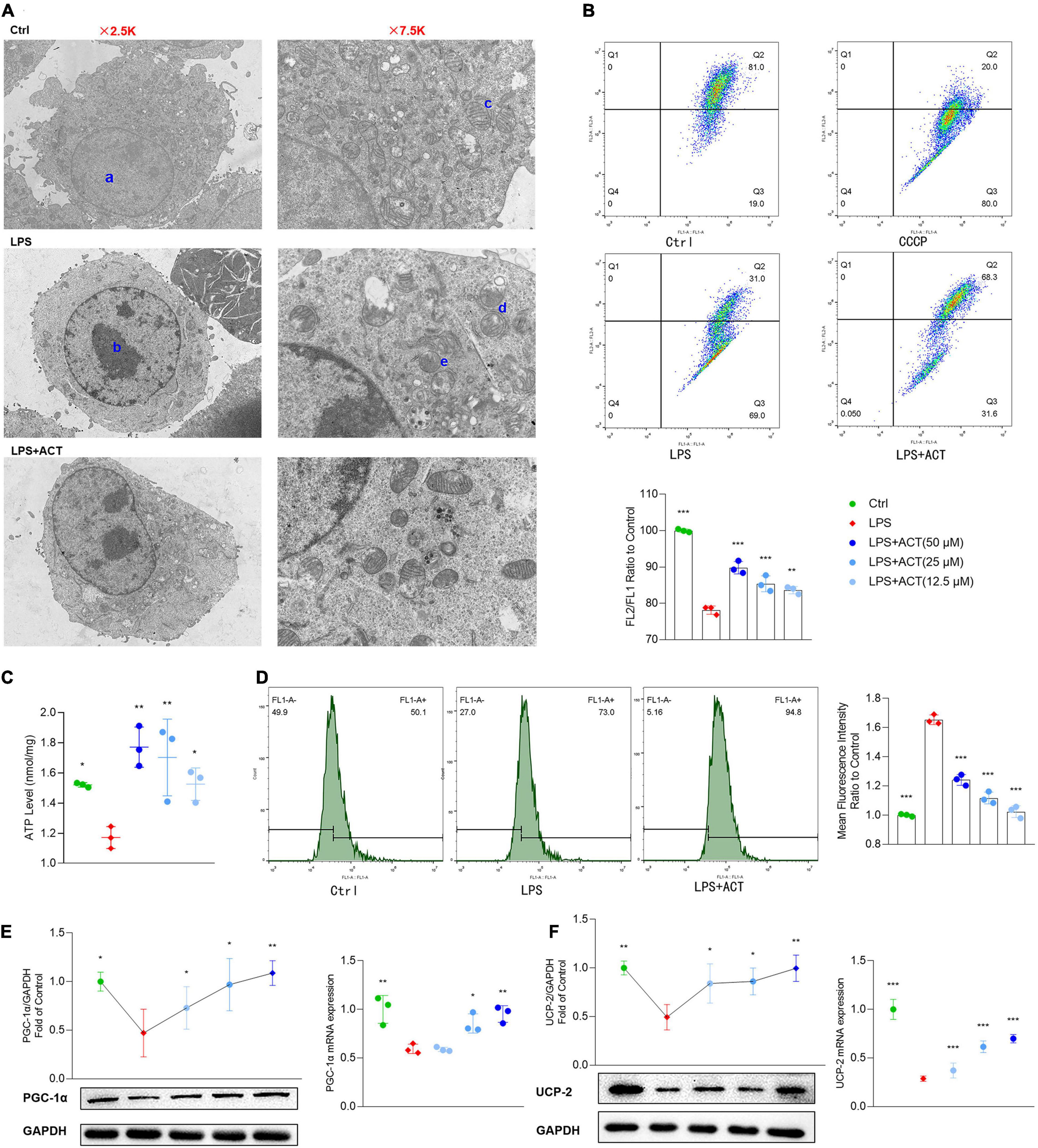 Figure 4. Effects of ACT on mitochondrial function in LPS-treated BV-2 cells. (A) Ultrastructural changes in the different groups of BV-2 cells under the transmission electron microscopy. a, normal nucleus. b, nucleus chromatin condensation. c, normal mitochondria. d, mitochondrial cristae disarranged or even disappeared. e, swollen and vacuolated mitochondria. (B) The representative images and bar graph of JC-1 red and green fluorescence ratio. (C) Bar graph showing quantified statistics of ATP level. (D) The representative images of DCFH-DA staining and bar graph of intracellular ROS production. (E) ACT distinctly decreases the protein and mRNA levels of PGC-1α. (F) ACT distinctly decreases the protein and mRNA levels of UCP-2. *P < 0.05, **P < 0.01, ***P < 0.005, versus the LPS group. n = 3.