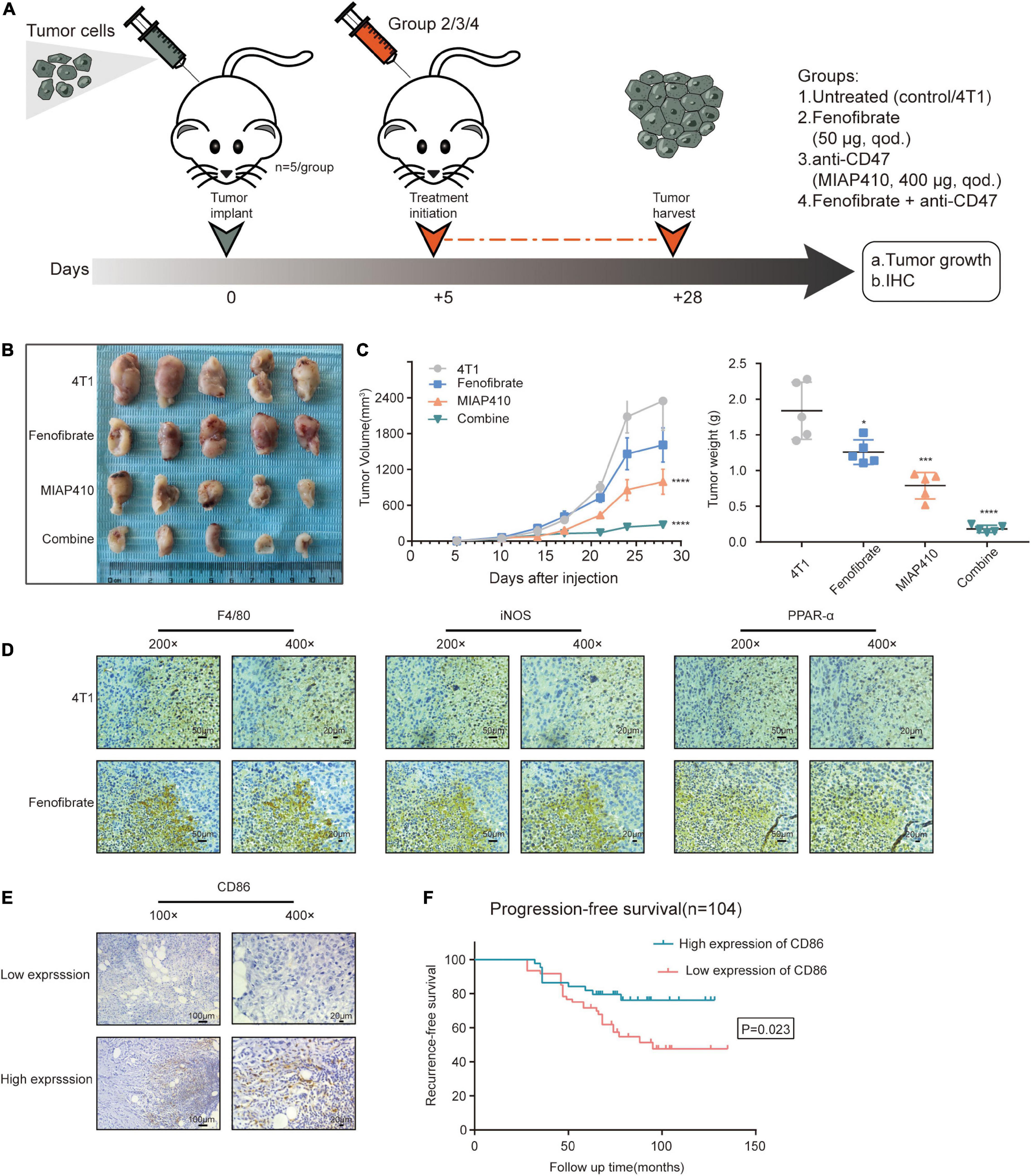 Figure 7. Fenofibrate combined with anti-CD47 inhibited tumor cell proliferation in vivo. (A) Experimental set up: Drug treatment model of tumor-bearing mice. (B) Images of tumors subjected to different treatments. (C) Tumor volume is determined by caliper measurements and is presented as mean (mm3) ± SEM. Tumor weights at day 28 are shown as mean ± SEM. n = 5/group. *p < 0.05, ***p < 0.001, ****p < 0.0001. (D) Immunohistochemical assay to confirm the expression of F4/80, iNOS, and PPAR-α in serial sections of tumor samples from FF and control groups. (E) Representative images of immunohistochemical staining for CD86 from human TNBC samples. (F) Kaplan-Meier recurrence-free survival curves of TNBC patients with low (n = 60) and high (n = 44) CD86 expression.