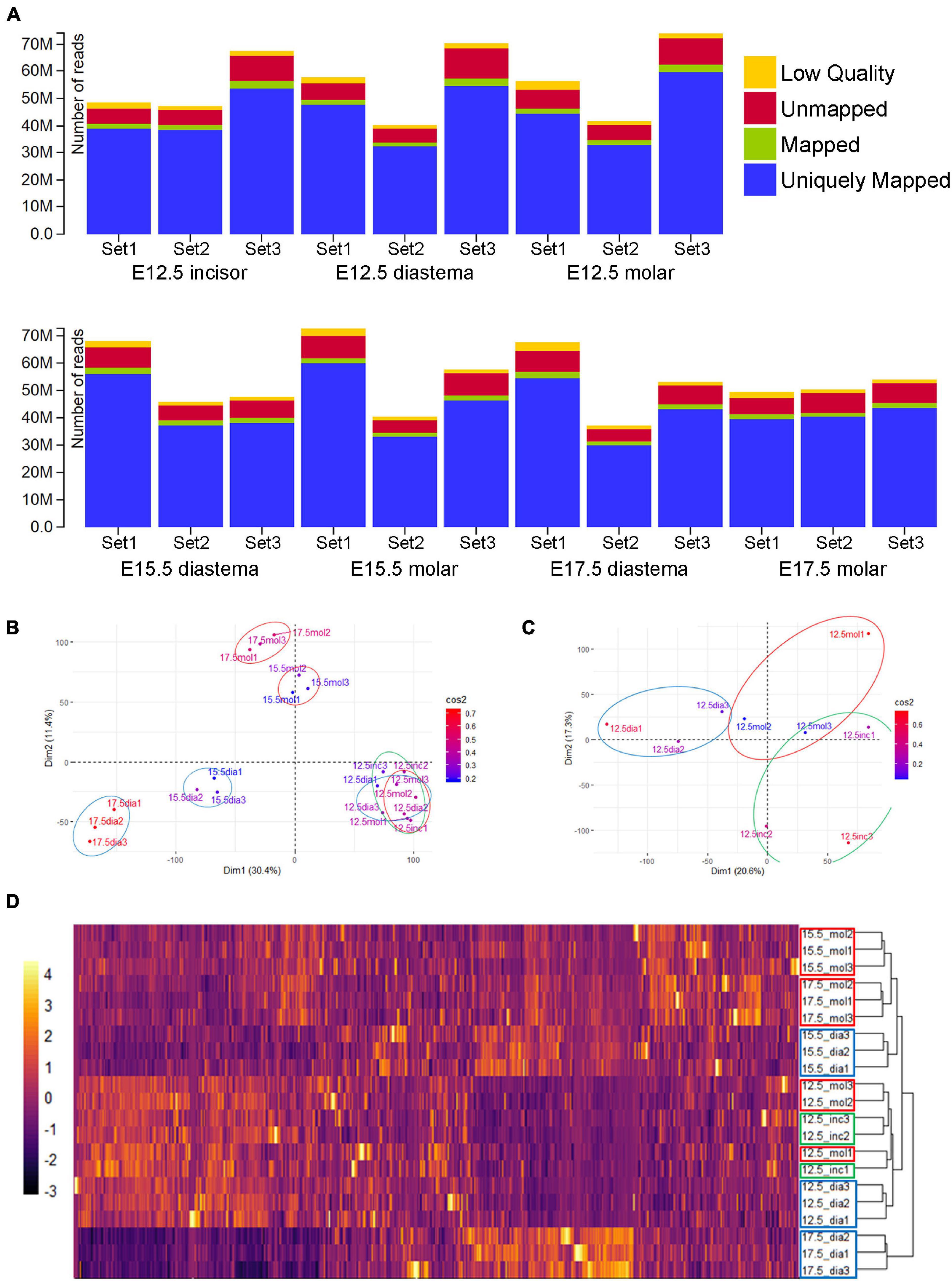 Figure 2. RNA-Seq data alignment and clustering. (A) Alignment results of 21 samples. More than 80% of total reads were uniquely mapped (the read mapped to exactly one location within the reference genome). (B) Principal component analysis (PCA) result of normalized gene expression (FPKM). E15.5 and E17.5 samples clustered by PC1 and PC2. E12.5 groups seem not separated well. (C) PCA result of E12.5 samples. Diastemas were separated from odontogenic regions by the PC1 axis. Incisors and molars were separated by the PC2 axis. (D) Heatmap of expression and dendrogram of 21 samples. E12.5 incisors and molar show a similar RNA expression. At E15.5 and E17.5, molars and diastemas had clustered with each other. Particularly, E17.5 diastema showed the most different pattern from other experimental groups.