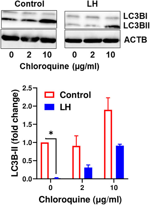 FIGURE 7. LH inhibits formation of autophagosomes. Cultures of small luteal cells were pretreated with chloroquine (2 and 10 μg/ml) for 1 h and then treated with LH (10 ng/ml) for 4 h. Representative blots and bar graphs show content of LC3B. Data are shown as average fold changes ±SEM from three separate experiments. Statistical analysis was performed using one-way with post hoc Bonferroni test. Significant differences are indicated with asterisks * as p < 0.05.
