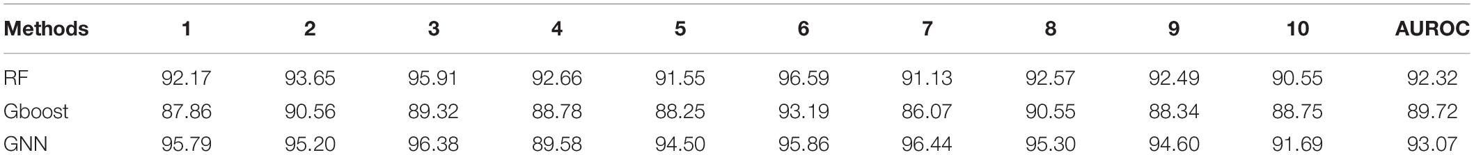 Table 10. Ten-fold cross validation accuracies for link prediction using RF, Gboost, and GNN in DDKG.