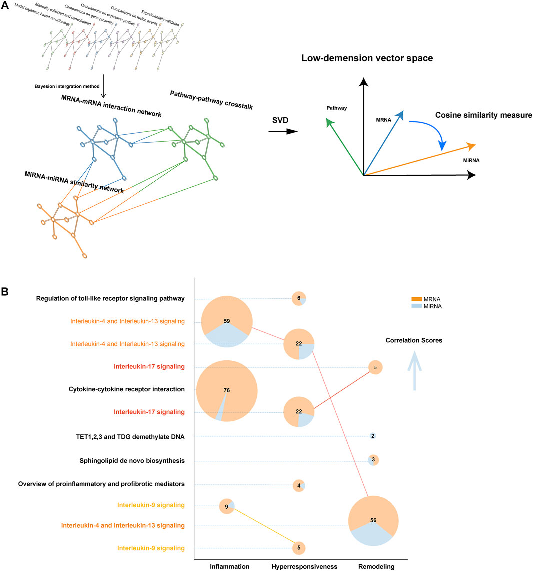 This study generates new insights into the pathogenesis of asthma by integrating disease characteristics, pathways, and SNPs information. Three typical disease characteristics were scrupulously determined according to the summary of asthma characteristics in classic retrospective articles (Papi et al., 2018; Zhu et al., 2020b), i.e., airway inflammation, airway hyperresponsiveness, and airway remodeling, etc. A contemporary catalog of corresponding risk transcriptome including mRNAs, miRNAs, and lncRNAs was manually established. This contributes to analyses of specific parts and the overlapping characteristics of asthma disease in terms of gene function and related pathways and a more detailed and comprehensive understanding of the pathogenesis of asthma. In consideration of the limitations of the current method of pathway identification when thoroughly applying to our gathered information, a novel algorithm MIMP was developed, which accurately and comprehensively identifies pathways while exploiting suboptimal networks and can take account of current and closely pathway-associated transcriptomics and proteomics information. The MMIP can be used to identify the pathway association for a disease feature-related blended miRNA-mRNA molecular set. We then construct a ceRNA network for each recognized disease feature pathway and systematically identify candidate functional lncSNPs and miRSNPs and their potential mechanisms on the pathway, based on current genetic findings for asthma, which can help to further elucidate their potential roles in the pathogenesis of asthma both in genetic variant and at the post-transcriptional regulation level.