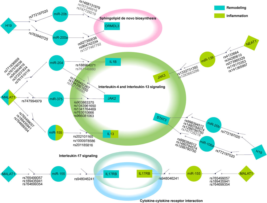 We generated a network-based dissection of the regulation to the pathway of ceRNA and ceRNASNPs. In total, 9 ceRNA regulatory networks composed of risk transcriptome were excavated from 7 risk pathways, of which 2, 4, and 3 were concerned with hyperresponsiveness, remodeling, and inflammation respectively. Then, we searched and exhibited the lncSNPs and miRSNPs in the ceRNA network while concentrating on three types (called regulatory SNPs), i.e., the 3′UTR, seed region of mature miRNA and miRNA binding site on lncRNA, which directly affects ceRNA regulation. We show the complete information of ceRNASNPs in Supplementary Table S4.