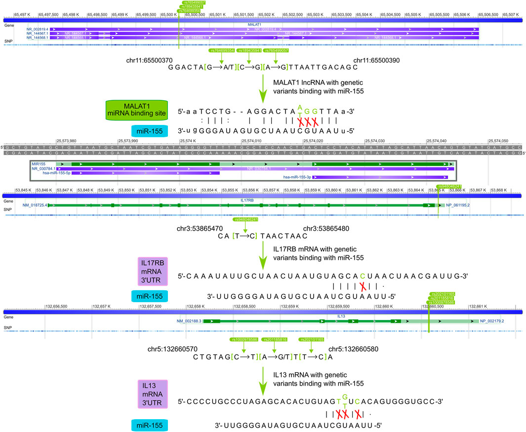 In molecular biology, competing endogenous RNAs (abbreviated ceRNAs) regulate other RNA transcripts by competing for shared microRNAs (miRNAs), and new mechanisms of interaction between RNAs have been revealed. LncRNA-miRNA-mRNA regulation is one such example. LncRNA molecules sequester shared microRNAs (miRNAs), thereby affecting the expression of other targets of the miRNAs. Individual ceRNA mechanisms have been broadly researched in asthma. Treg/Th17 imbalance plays an essential role in the pathogenesis of asthma. A study found that alternation of LncRNA-MEG3 can change the function and result in increasing the percentage of Th17. Subsequent experiments indicate that LncRNA-MEG3 could inhibit the level of microRNA-17 as a competing endogenous RNA (ceRNA) and the microRNA-17 suppressed Th17 though targeting RORγt directly (Qiu et al., 2019). The sequence complementarity and thermodynamics of miRNA-lncRNA and miRNA-mRNA binding play crucial roles in their interactions. Hence, it is conceivable that lncRNA-associated or miRNA-associated single nucleotide polymorphisms (lncSNPs or miRSNPs) could influence the regulation of lncRNAs or miRNAs (Wilk and Braun, 2018; Gebert et al., 2020).