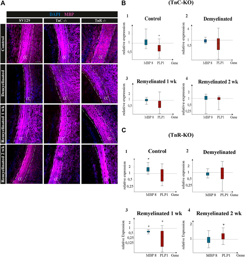 Taken together, this study revealed that both Tnc and Tnr intervene in the remyelination capacity of oligodendrocytes. This could be shown by studying the remyelination behavior of WT and knockout specimens, and by adding the purified ECM proteins to lysolecithin-treated WT cerebellar explants. In order to examine their roles in an in vivo situation, the cuprizone model was successfully established in Tnc−/− and Tnr−/− mice, as confirmed by LFB- and MBP-staining. While demyelination and remyelination occurred as expected, the differences between the WT, Tnc−/−, and Tnr−/− mouse lines were small and did not achieve statistical significance with respect to several parameters. This may be due to the duration of the exposure to cuprizone, which was limited to six weeks, reflecting an acute lesion situation. The tendencies observed may become relevant in a chronic setting, where cuprizone treatment could be extended to ten weeks. The roles of tenascins in the mimic of a chronic disease course remain to be explored in a future study.