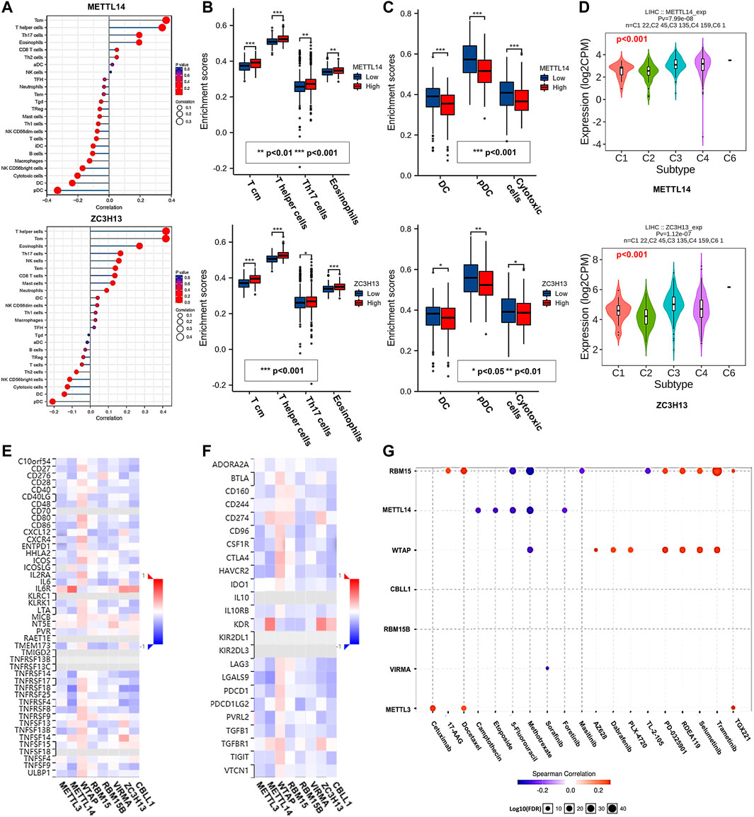 FIGURE 9. Correlations between the m6A writer complex and tumor immunology in HCC. (A) Relationship between the m6A writer complex and immune cell infiltration in HCC. Box plots show immune cells positively (B) and negatively (C) correlated with the m6A writer complex in HCC. (D) Correlations between the m6A writer complex and immune subtypes in HCC (TISIDB). Kruskal–Wallis test, p < 0.05 was regarded as statistically significant. C1: wound healing, C2: IFN-γ dominant, C3: inflammatory, C4: lymphocyte depleted, C5: immunologically quiet, C6: TGF-β dominant. Heatmaps show correlations between the m6A writer complex and the expression of immunostimulators (E) and immunoinhibitors (F) in HCC (TISIDB). (G) Correlations between the m6A writer complex and drug sensitivity in immune or targeted therapies (GSCALite). Red and blue represent positive and negative correlations, respectively.