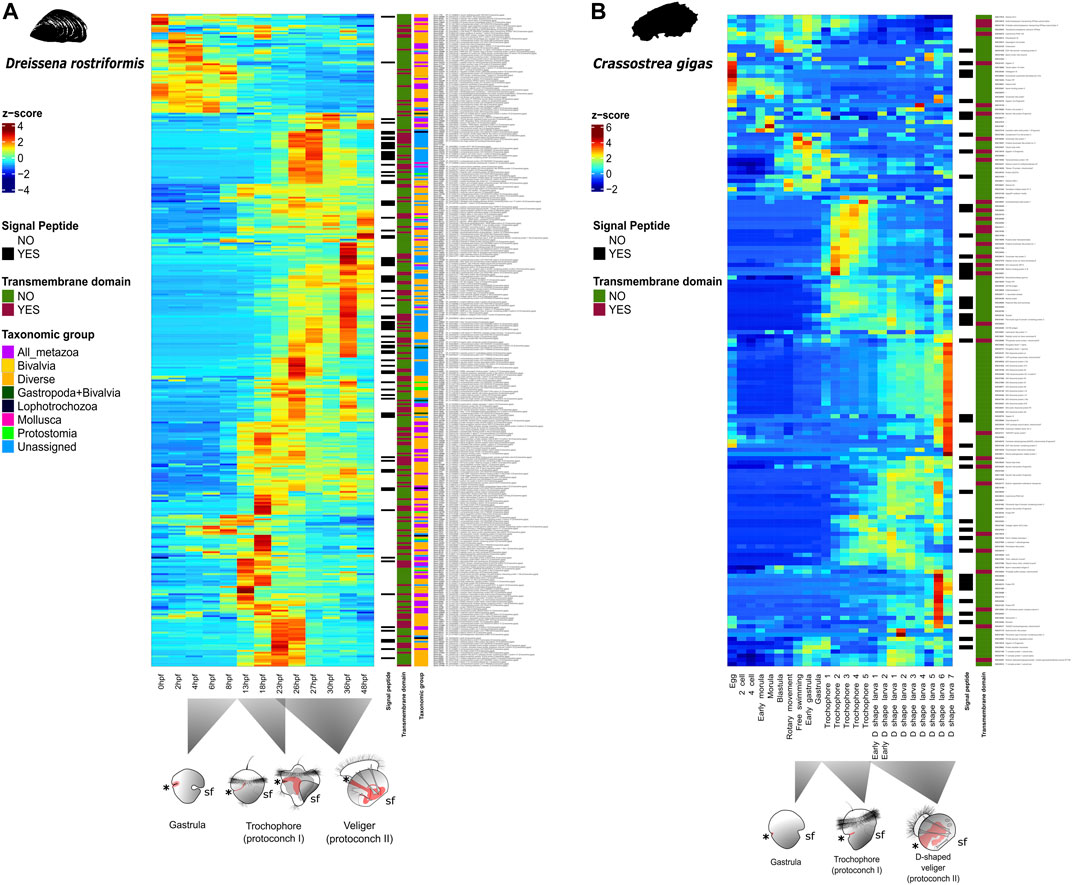 FIGURE 2. Relative quantitative expression of shell field-specific genes during development of two bivalve species. (A) Heat map showing relative normalized expression levels for each isolated gene from the shell field of the trochophore of Dreissena rostriformis. Normalized gene expression (transcripts per million; TPM) is depicted in graded shades of red when values are above the median, those below this threshold and with a value close to zero are in shades of blue. Details on gene annotations, orthogroup assignments to the respective taxonomic level, presence of signaling peptides, and transmembrane domains are provided in Supplementary Table S2. Blast top hit to the Pacific oyster is next to each gene name. Time after fertilization (hpf) and corresponding developmental stages at 23°C are ordered chronologically at the bottom of the x axis. Germ layers and their major derivatives in animal schemes are depicted in grey (mesoderm), red (endoderm), and white (ectoderm), respectively. Asterisks mark the blastopore/mouth, sf indicates the shell field. (B) Heat map showing relative normalized expression levels of genes isolated from larval and adult shells of Crassostrea gigas as described in Zhao et al. (2018). Normalized gene expression is depicted in graded shades of red when values are above the median, those below this threshold and with a value close to zero are in shades of blue. Each developmental stage is organized chronologically from left to right on the x axis. Details on gene annotations, orthogroup assignments, presence of signaling peptides, and transmembrane domains are provided in Supplementary Table S9 (cf. Zhao et al., 2018).