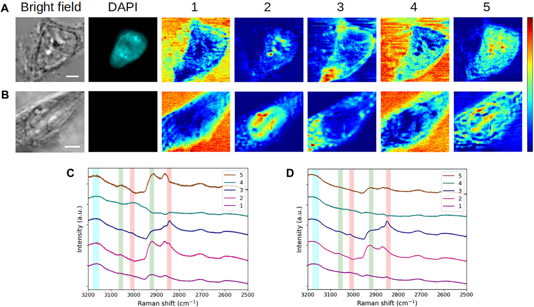 In the context of label-free cell imaging, vibrational spectroscopic approaches have proven their effectiveness to visualize the cellular content and processes (Matthäus et al., 2008; Klein et al., 2012; Palonpon et al., 2013; Smith et al., 2016). As chemically selective techniques, they can provide both structural and functional information from the sample. Among these techniques, coherent anti-Stokes Raman scattering (CARS) and stimulated Raman scattering (SRS) have been extensively applied to live-cell imaging in the last 2 decades (Zumbusch et al., 1999; Freudiger et al., 2008; Cheng and Xie, 2015). More specifically, both methods have been successfully used to probe the intracellular lipid, protein, nucleic acid, and water content with a high-acquisition rate and sensitivity.