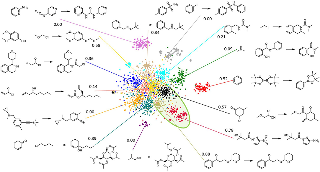 Figure 7. Visualization of a fraction of the reaction space via t-SNE, where reactions are colored by the categories assigned via the Gaussian mixture model (GMM) for a subset of 15 categories (compared to the full model's 500). A representative example for each GMM category is shown, along with the score of each category. All categories (except the red one) with a score (cfr. equation 2) that is >0.5 are grouped closely together in the same highlighted green region of the reaction space.