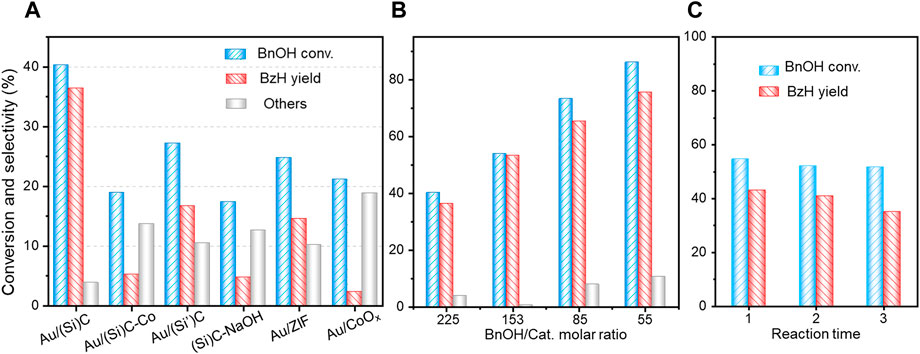 FIGURE 5. (A) Catalytic performances of alkali-free BnOH oxidation via the derived Au/(Si)C and different references. (B) BnOH conversion as a function of reaction time. (C) Stability test of Au/(Si)C. Reaction conditions: A BnOH/Au molar ratio of 225 with 30 mg catalyst was used in (A) for better comparison (20 ml/min O2 flow, 80 °C for 4 h). A BnOH/Au molar ratio of 486 with 7 mg catalyst was used in (C) to understand the catalytic stability under limited catalyst dosage. (Si)C-NaOH:SiO2@ZIF-Ar after NaOH etching to remove the silica template; Au/(Si)C:(Si)C-NaOH with gold loading after calcination at 300 °C for 3 h; Au/(Si’)C: a similar sample using silica with 350 nm spheres; Au/(Si)C(-Co):Au/(Si)C etched with HCl to remove Co species; Au/ZIF:ZIF-67–supported Au; Au/CoOx:CoOx powder–supported Au particles. ‘Others’: other by-products in the reaction, primarily toluene.