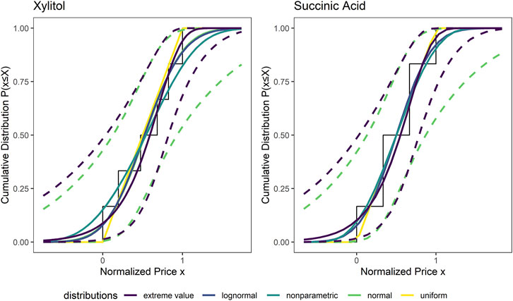 FIGURE 9. Cumulative density functions of all investigated distributions for the xylitol and the succinic acid price data.