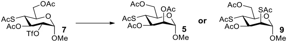 Therefore, the substitution on 2-triflated intermediate 7 by acetate/thioacetate was used as a model reaction to test under various acidic/basic conditions (Table 1). Substitution of 7 with acetate in acetonitrile or DMF led to a complex mixture (entry 1). To our delight, with the addition of more and more acetic acid to this reaction system, the target 5 was isolated for better and better yield (entries 2–5). Especially, the yield of 5 when using Ac2O as the solvent (entries 6 and 7) was 76–78% as compared with the 50% yield when using acetic acid as the solvent (entry 5). This must be because Ac2O greatly inhibited the generation of thiol groups by reacting with thiol groups to form thioacetates. Substitution of 7 with 5 equiv of thioacetate in acetonitrile yielded the target 9 in 56% yield (entry 8). The yield of 9 was increased to 75% when 1.5 equiv of thioacetic acid was added to this reaction system (entry 9). However, the addition of more thioacetic acid decreased the yield of 9 (entries 10 and 11). Substitution of 7 with 5 equiv of thioacetate in DMF in the absence/presence of 1.5 equiv of thioacetic acid yielded 9 in 70/90% yield, respectively (entries 12 and 13). These results indicated that our hypothesis was reasonable. The substitution on a substrate containing a thioacetate group by thioacetate/acetate could be improved by suppressing the formation of thiol and by adjusting the acidity/basicity of the reaction system.