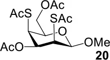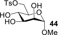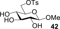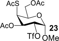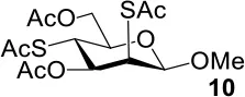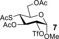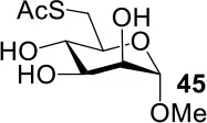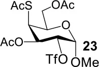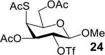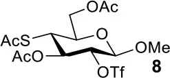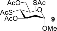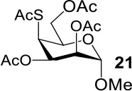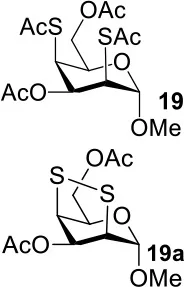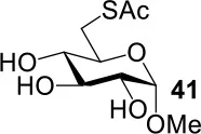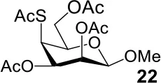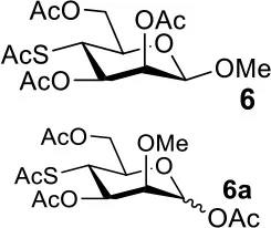 The synthesis of 2-OAc-4-SAc methyl glycosides 5, 6, 21, and 22 failed in Schemes 2, 3. However, with Ac2O used as the reaction solvent instead, 5, 6, 21, and 22 were successfully synthesized in medium to high yields (47–78%) starting from their 2-OTf intermediates 7, 8, 23, and 24 (entries 1–4 in Table 2). The main side-products seemed to be caused by 1-OMe group participation, such as 6a (Figure S2 in Supplementary Material). The yields of 2,4-di-SAc glycosides 9, 10, 19, and 20 were increased by 9–13% compared to the reaction without the addition of 1.5 equiv of thioacetic acid (entries 5–8). The main side-products seemed to be caused by the oxidation of intra-molecular thiol groups, such as 19a. Substitution of 6-OTs glycosides 40, 42, and 44 with potassium thioacetate in DMF, the yields of 6-SAc glycosides 41, 43, and 45 were increased by 10–16% compared to the reaction without the addition of 0.5 equiv of toluene sulfonic acid (entries 9–11).