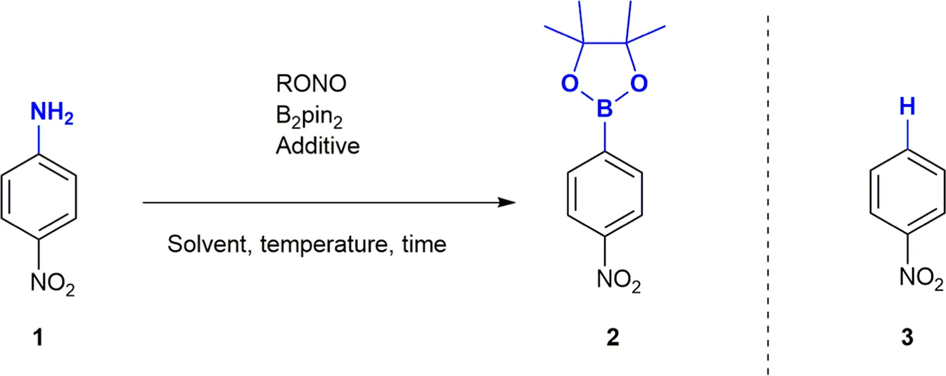 We began our investigation on the borono-deamination of anilines (Table 1) using 1.2 equivalents of bis(pinacolato)diboron (B2pin2), 1.5 equivalents of tert-butyl nitrite and 4-nitroaniline 1 as a model compound and determining yields of 4-nitrophenylboronic acid ester 2 by 1H NMR spectroscopy. Initial tests produced only 49.8% yield of the borylated compound in addition to 4-nitrobenzene 3 (proto-deaminated analogue) as the main products of the reaction. In general, benzene formation was observed as the major side reaction but tended to be lower in aprotic solvents of low polarity and in absence of Lewis acids. Unreacted diazonium salt was a major side product in CH2Cl2 and 2,2-dimethylpropanol (entries 1 and 7). In the solvent screen, MeCN was shown to be the best solvent for the reaction, particularly when changing the nitrous acid ester to amyl nitrite (AmylONO), which gave 65.5% yield (entry 5). MeCN is considered most green amongst the dipolar aprotic solvents (Byrne et al., 2016; Prat et al., 2016) and is easy and safe to handle under common HSE guidelines. As a byproduct of bulk acrylonitrile monomer production and a preferred (U)HPLC solvent, MeCN will remain available and in use for decades to come.