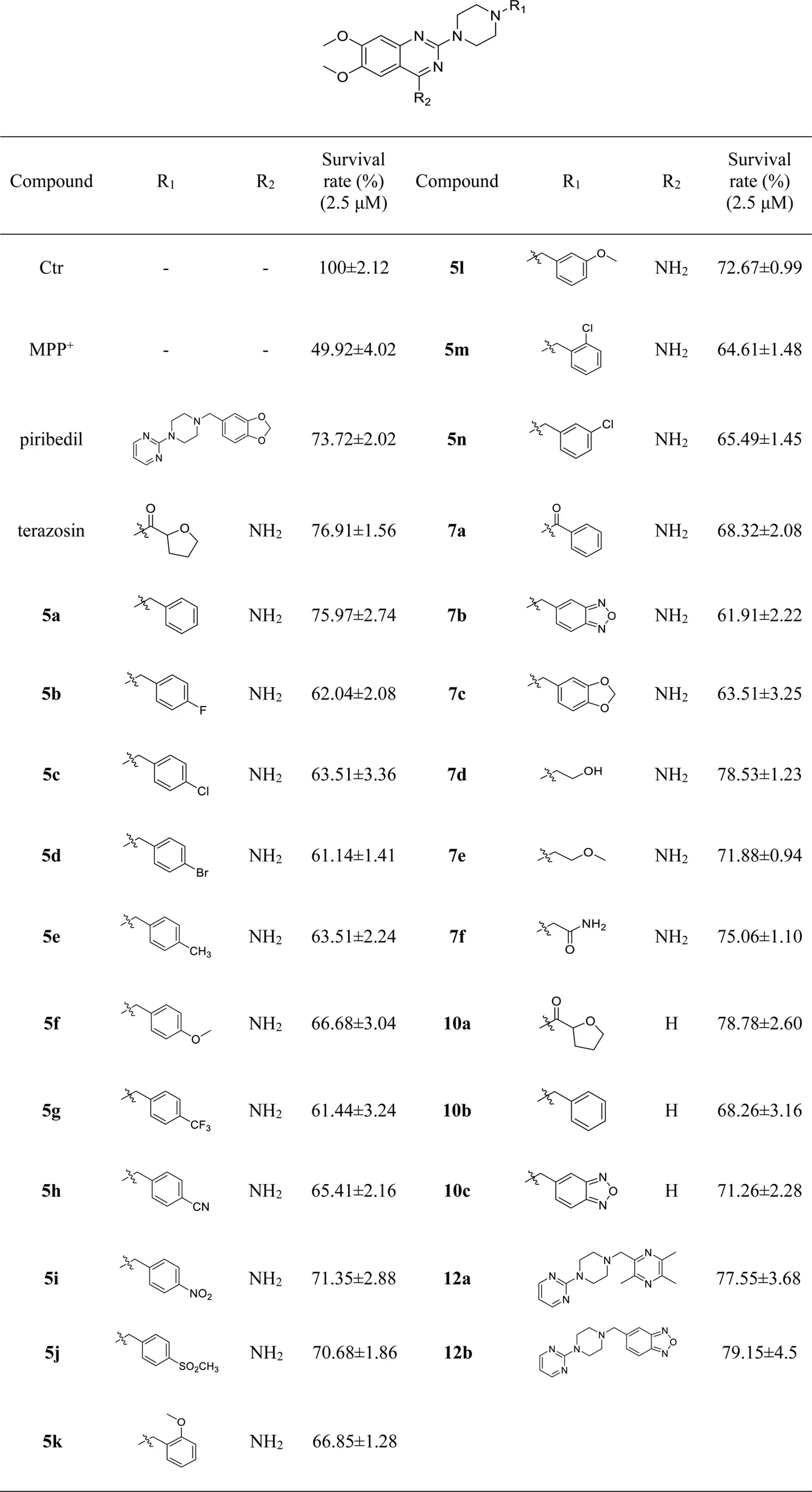 We first evaluated the neuroprotective activity of all target compounds through the MPP+ induced SH-SY5Y cell injury model. Terazosin and piribedil were used as positive controls. Dosing concentration refers to the test results of terazosin (Supplementary Figure S26), and is uniformly set to 2.5 μM. The results are shown in Table 1. Almost all terazosin analogs showed protective effects. Among them, the neuroprotective activities of compounds 7d, 10a, 12a and 12b are close to or stronger than those of the control drugs.