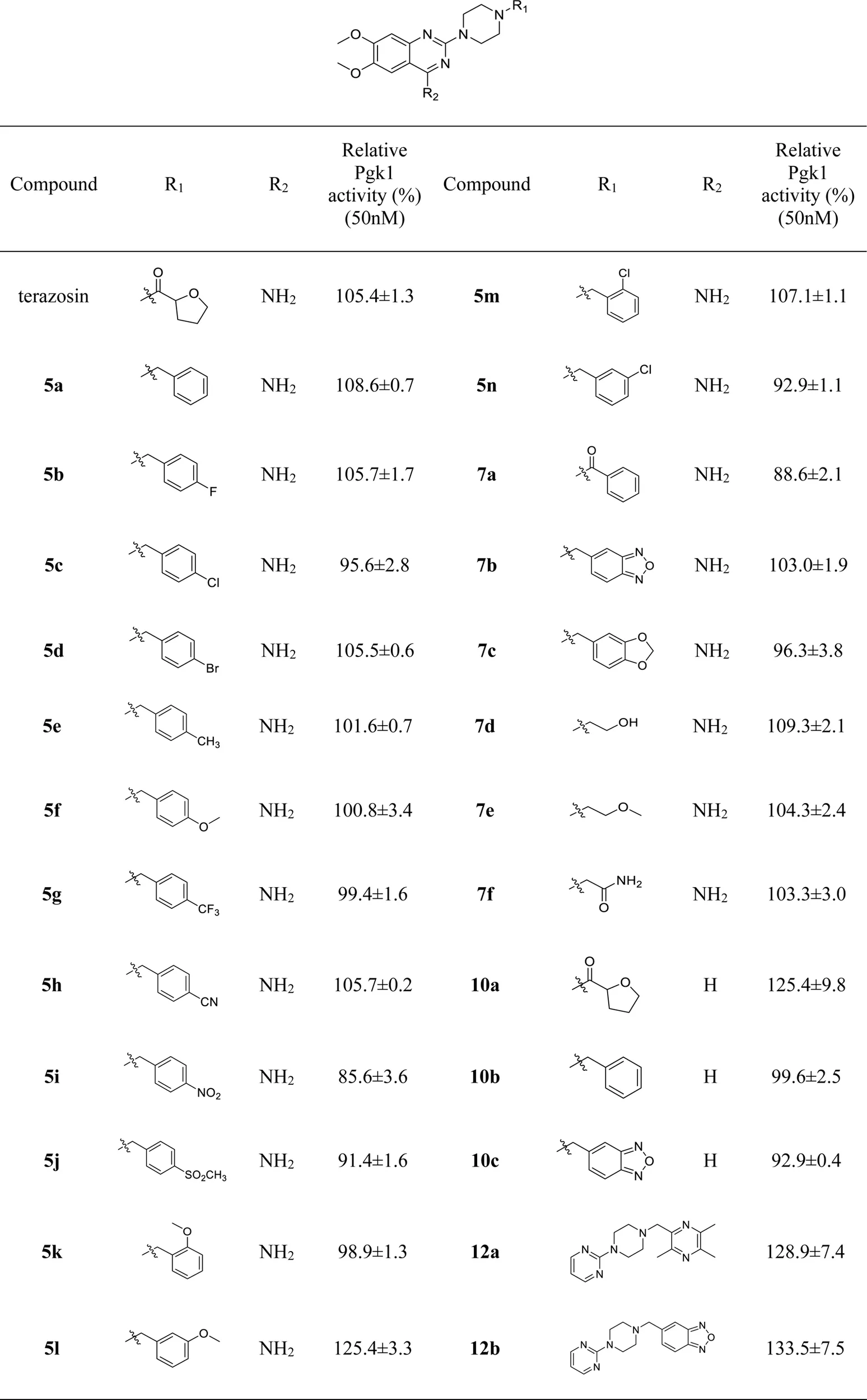 Referring to the reported optimal activation concentration of terazosin on Pgk1, we evaluated the agonistic activity of all terazosin analogs on Pgk1 in vitro, terazosin was used as a positive control. The results are shown in Table 2. At the concentration of 50 nM, some terazosin analogs showed Pgk1 agonistic activity. Among them, 5l, 10a, 12a and 12b are significantly stronger than the others, even better than the control drug.