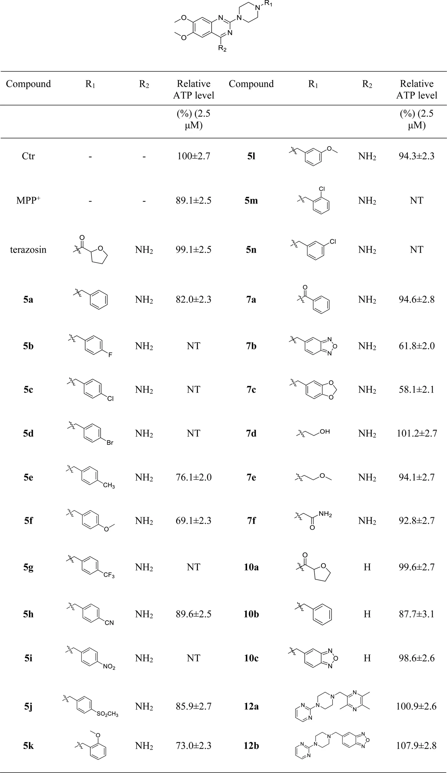 Intracellular ATP level is essential for cell survival, and Pgk1 has the function of promoting ATP production, which helps to maintain the function and survival of nerve cells. Based on the above factors, we evaluated the effects of terazosin analogs on the ATP levels in SH-SY5Y cells induced by MPP+. Terazosin was used as a positive control. The results are shown in Table 3. The effects of compounds 7d, 10a, 12a and 12b significantly increase ATP levels in SH-SY5Y cells induced by MPP+ at a concentration of 2.5 μM. This is consistent with their neuroprotective effect.