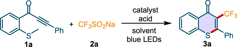 We chose methylthiolated alkynone (1a) and CF3SO2Na (2a) as model substrates to investigate the perfluoroalkylation/cyclization reaction in CH3CN under 18 W blue LEDs irradiation at 35°C. Fortunately, when Acr+-Mes·ClO4− was used as the photocatalyst and HCl as the acid additive, 1a and 2a could be converted into the corresponding trifluoromethylated thioflavone 3a in 37% yield (Table 1, entry 1). Evaluation of the different photocatalysts showed that Acr+-Mes·ClO4− was the best photocatalyst for this process (Table 1, entries 2-4). Different acidic additives were screened to further improve the efficiency of this transformation (Table 1, entries 5-8). The experimental results indicated that trifluoroacetic acid (TFA) showed the highest reactivity, affording 3a in 44% yield (Table 1, entry 7). To further improve the yield, a range of solvents, including DCM, DCE, CHCl3, 1,4-dioxane, DMF, DMSO, EtOH, H2O, and acetonitrile aqueous were evaluated (Table 1, entries 9-20). The mixed solvent CH3CN/H2O (v/v = 10:1) was found to be the optimal solvent system, and the desired product 3a could be obtained in 56% yield (Table 1, entry 19). Furthermore, increasing the amount of 2a to 3 equiv afforded the highest yield (Table 1, entry 21). The control experiments confirmed the photochemical nature of this transformation, as no product was observed in the absence of photocatalyst or visible light (Table 1, entries 22-23). The reaction efficiency was decreased to 35% in the absence of TFA, which indicated that the acid plays an important role in promoting the transformation (Table 1, entry 24). Taken together, the optimal reaction conditions were established as follows: 1a (0.2 mmol), 2a (3 equiv), Acr+-Mes·ClO4− (5 mol%) as catalyst, TFA (1 equiv) as additive, CH3CN/H2O (v/v = 10:1) as solvent, at 35°C under the irradiation of blue LEDs (λmax = 460 nm) for 5 h.
