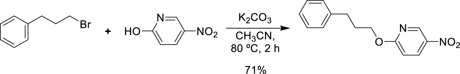 5-Nitro-2-(3-phenylpropoxy)pyridine (5-NPPP) was synthesized by treating (3-bromopropyl)benzene with 5-nitropyridin-2-ol in a basic medium provided by K2CO3 in acetonitrile solvent. The reaction was carried out at 80 °C for 2 h.