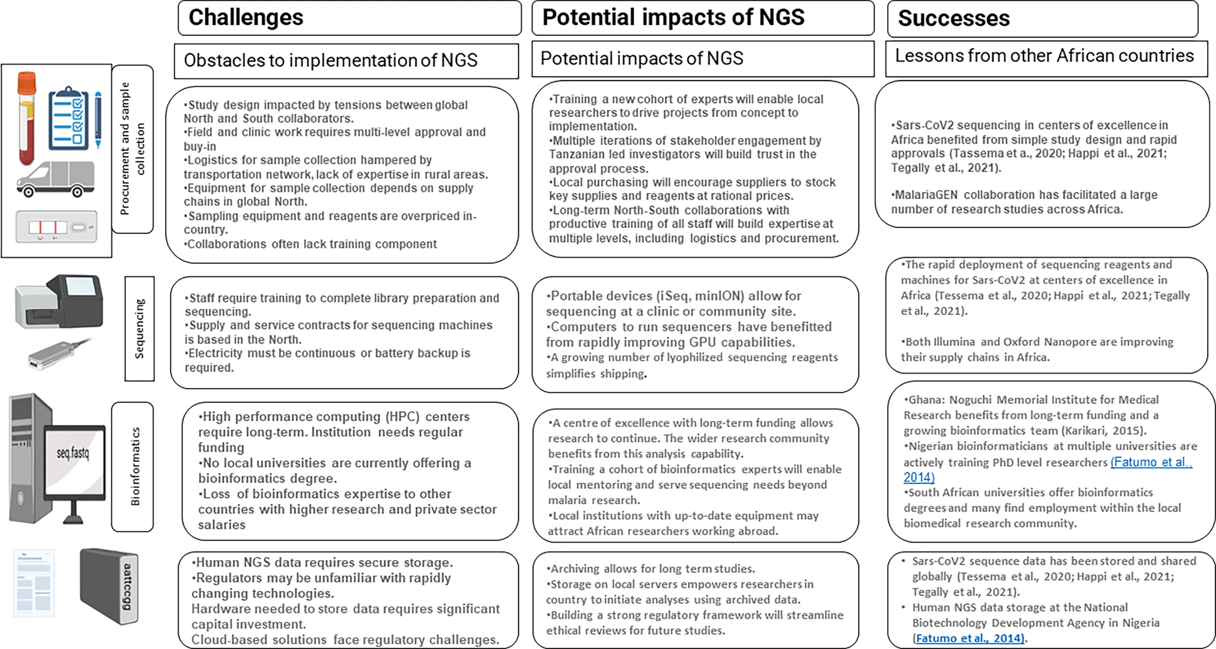 NGS studies produce large amounts of data that is analyzed with an ever-evolving suite of bioinformatics tools. Adequate data storage is a significant cost and requires in-house expertise. Few African institutions are training bioinformaticians, and those that are trained may leave for better paying jobs in the North-centered biotechnology industry. Building high performance computing clusters will require sustained investment, as will building up a cohort of bioinformaticians to work on African infectious disease sequencing projects. There is also a need to develop local expertise for equipment installation and maintenance to prevent long delays and additional costs accrued from overseas outsourcing (Apinjoh et al., 2019). Examples of institutions that have successfully built bioinformatics systems include the Noguchi institute in Ghana (Karikari, 2015, Redeemer’s University in Nigeria (Fatumo et al., 2014, and several South African universities.