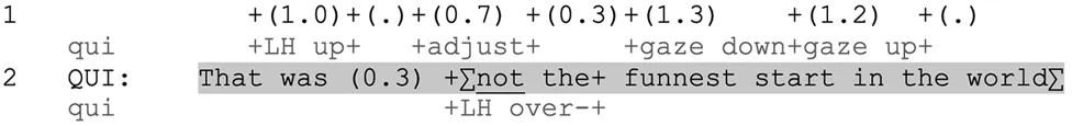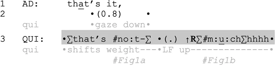 Progressivity is a central concern for participants, both regarding the advancement of interpersonal interactional sequences as well as internal components of individual speaker turns (Schegloff, 2007, pp. 14–15). Nevertheless, disruptions1 to syntactic progressivity occur in many different scenarios in interaction; parenthetical clauses, word searches, self-repair, certain question formats, and collaborative completions all exploit the normatively through-produced nature of syntax, and are dealt with in systematic ways by the interacting parties. For example, parenthetical clauses can be inserted into clauses that were already in progress and projected to be complete, which results in temporarily halting, then resuming, the parent clause’s syntax (Mazeland, 2007). This “enables a speaker to reconcile the potentially contradictory requirements that the linearity of speech production poses to the speaker’s orientation to recipient design” (Mazeland, 2007, p. 1816). Word searches, a type of self-repair, constitute another instance of compromising progressivity, as they are also initiated by a disruption in the utterance, resulting in a delay in the middle of an ongoing turn-constructional unit (TCU) (M. H. Goodwin and Goodwin, 1986; Hayashi and Yoon, 2006). In this paper, we are likewise focusing on structures that involve the process of suspending a clause that was projected to be complete, rather than just any word combinations. While mid-TCU silences have mostly been connected to cognitive trouble, such as in word searches, we will argue that they can also be related to bodily concerns.