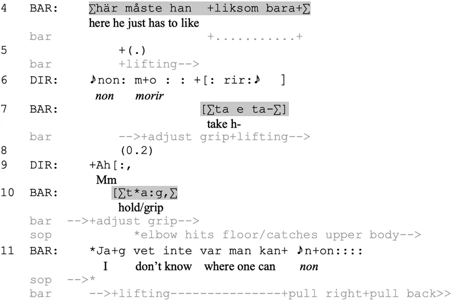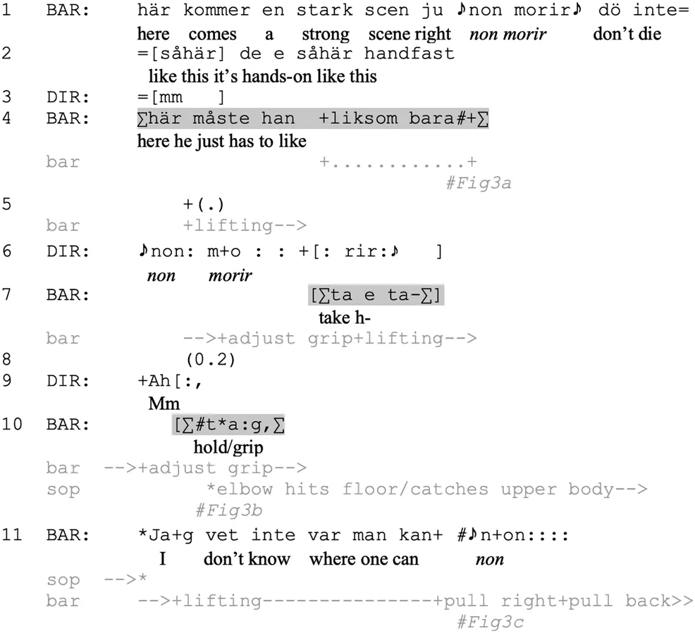 During the opera rehearsal, bara or its shortened form ba (Eriksson, 1995) is frequently used to introduce depictions–embodied iconic representations of distal “scenes” (Clark, 2016), also known as for instance animations (Cantarutti, 2020), reenactments (Sidnell, 2006b) and reported speech (Holt, 2007). It is therefore possible to treat the syntax as completed by the bodily movements of the baritone (see Keevallik, 2018); his embodied depiction can act as an alternative to the complement of the projected clause. The director treats the ensuing actions in this way, by positioning herself as a co-animator of the embodied depiction and voicing the musical lines that he should perform at this point (line 6). Furthermore, the strain involved in the lift is visually available, as the baritone has not yet finished successfully lifting the soprano and appears to be repeatedly readjusting his grip. Co-animating at this point supports the baritone’s depiction by providing libretto material he may not be able to produce. However, the baritone does not orient to the director’s co-depiction, overlapping it with an utterance voiced as himself, the performer, rather than as his character: he describes his attempts to get a grip on the soprano in order to lift her (line 7–10), in synchrony with his physical attempts to do so. The director, in response, likewise switches from a depiction of the baritone’s character to commentary as herself, a director, in the current action (line 9, a continuer). The baritone thus bypasses the director’s contribution in the depiction, reorienting them both to the ongoing physical strain in his performing body. In retrospect, this emerges as a syntactic suspension of the structure liksom bara ta tag “has to like take hold” whereby the director’s singing ends up being treated as a side activity.