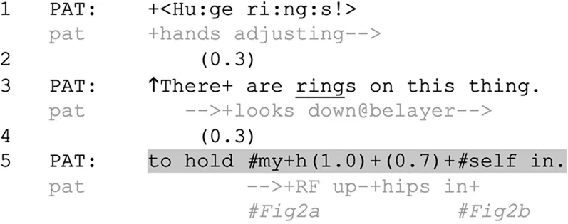 That this is a display, not just a physiological byproduct, is evident in that the speakers are capable of timing their speech to occur in moments of strain. For example, in Extract 2, Pat produces a complete clause without a suspension (line 3). This co-occurs with hanging, rather than moving; Pat is relatively relaxed and unstrained in this position. Climbers are not forced to move at any given point, nor are they required to talk while climbing (as above) or demonstrating a motion (as with opera rehearsals, below). Yet Pat continues to speak (line 5) when initiating and undergoing a movement that causes bodily strain. By designing or permitting talk to co-occur with motion and strain, the participants create the conditions wherein a syntactic suspension can function. In other words, timing talk to co-occur with motion and strain provides a slot in which a display of that strain can be done with suspended talk, as the body provides a visible account for suspending syntax. Speech can be prioritized even over physiological needs, such as full ventilation (Hixon et al., 2018), and the syntactic suspensions take advantage of the ability to switch between priorities, live. The body’s motion is concurrent with the entire utterance, however in the silent moment, the body is rendered as the most salient part of the display—by removing language production, the body becomes the main focus of attention. The suspensions are timed to strategic moments that highlight relevant issues for the speakers, such as a challenging body position or move.