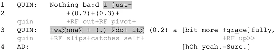 In contrast, when any suspension occurs after a point of possible completion, a co-participant does take a turn. For example, in Extract 4, after two suspensions from Quin that occur in the middle of clauses, the third silence (line 3, 0.2) occurs at a possible completion point of the clause: I just wanna do it. Adam treats this as a potential transition relevance place, and takes a turn (line 4), overlapping Quin’s increment (line 3). Thus, even though Quin has just slipped, is currently in the process of stabilizing his body, and may be temporarily unable to continue speech (all of which Adam can see), Adam still treats this particular silence (but not the previous ones) as a transition relevance place. This suggests that the position of the suspension in the middle of a clause, at a position that is not a possible completion point (Schegloff, 1996), is critical to the achievement of the suspension practice. In suspending at moments where the syntax is incomplete, the speaker takes advantage of the normal projectability of syntactic completion. When a clause is incomplete, all of the co-present climbers in the above examples treat the turn “space” as unavailable, as in the middle of the climber’s TCU and not an opportunity to take a turn. They do this by withholding talk until a possible completion point. Participants can hold the strain display over significant temporal delays (e.g., 1.7 s, Extract 2 line 5), without co-participants treating the silence as abandonment or a lapse (Hoey, 2020), due to the availability of the bodily preoccupation as an account.