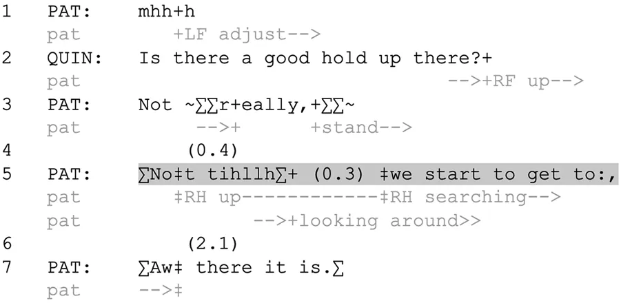 As the climbers engage their bodies in additional exertion (especially the abdomen, including the diaphragm, which is associated with the function of breath holding, Parkes, 2006), they suspend their talk. The exertions above include lifting a foot/leg (Extract 2, line 5; Extract 4 line 2–3), raising a hand while lifting the body (Extract 3, line 2; Extract 5, line 3–5), and catching oneself during an unexpected slip (Extract 4, line 3). The suspensions occur in the middle of a projectable clause, at moments of “maximum grammatical control” (Schegloff, 1996, p.93). For example, beginning with Extract 2, when Pat suspends his speech at “to hold myh” (Extract 2 line 5), he has projected either a noun phrase (e.g. my body) or a compound word (what he ends up producing, myself). This is not a point of possible completion for a TCU (it is, currently, a “fragment,” Selting, 2001), and so not a place for the co-participants to take a turn. Pat completes the clause starting the moment his foot gets in position underneath him, which coincides with the moment his muscles can relax, relatively speaking, since he is more securely supporting his weight.