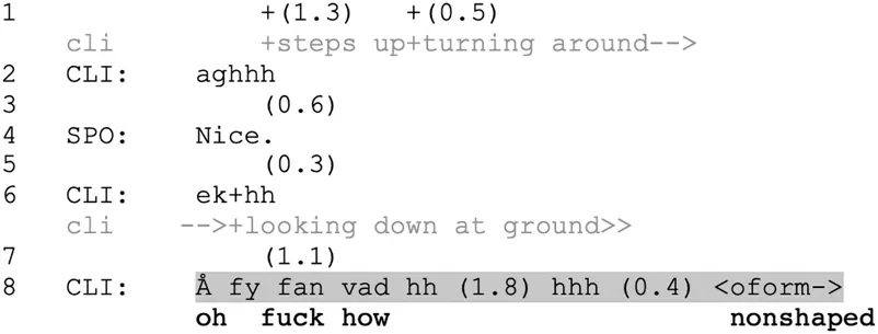 Another way to enact ongoing bodily effort is to preface or intersperse the suspension with breathiness or outbreaths, as if “catching one’s breath” (a feature also found in experimental instances: Trouvain and Truong, 2015), likely reflecting the body’s increased need of oxygen due to the strenuous activity (Hixon et al., 2018). In Extract 8, the Swedish-speaking climber (CLI) has just completed a climb and is looking down from the top of the boulder. He is breathing heavily (line 2, 6), and when he appears to have enough breath to talk again, he begins to assess his climbing performance with a beginning of a routinized assessment format vad “how”. However, before continuing the syntax, he takes another breathing break (middle of line 8), and still does not make it to a grammatical completion. The next word is creatively assembled, rather than a conventional continuation (oform “nonshaped/out of shape”) but as an evaluative item it pragmatically continues the projection from the format-initial item.