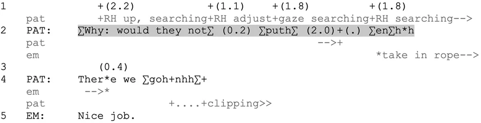 The clause that Pat started suddenly becomes irrelevant, as he discovers the safety bolt just before the silence ends. The grunt (line 2, “enh”) occurs as Pat repositions his hand to have proper leverage to connect his rope to the safety bolt. In other words, once it becomes pragmatically unnecessary to complete the clause, the suspension is interrupted, in this case by a grunt. The grunt reorients to the physical effort involved in grasping the hold and using the bolt, and may act as an upgrade of further strain that occurs while a suspension is already ongoing. This suggests that grunts may allow exit from a suspension that can no longer be achieved coherently.
