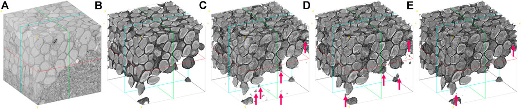 FIGURE 8. Visual comparison of the larval zebrafish EM volume segmentation. (A) Input serial-section EM volume. (B) Manual segmentation (ground truth). (C) U-net (Ronneberger et al., 2015) result. (D) RDN (Fakhry et al., 2017) result. (E)